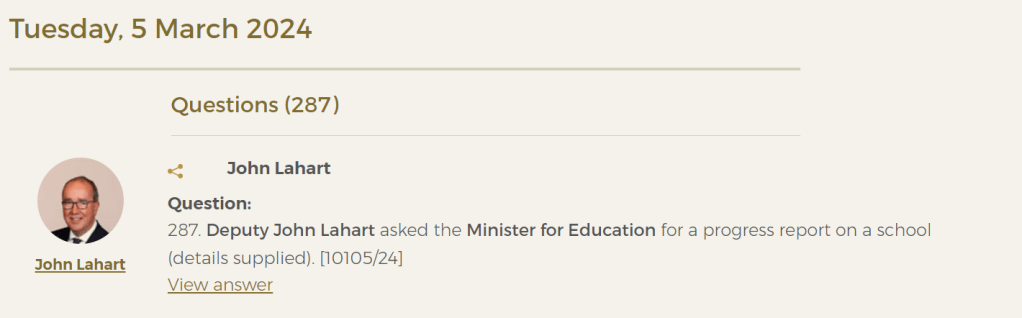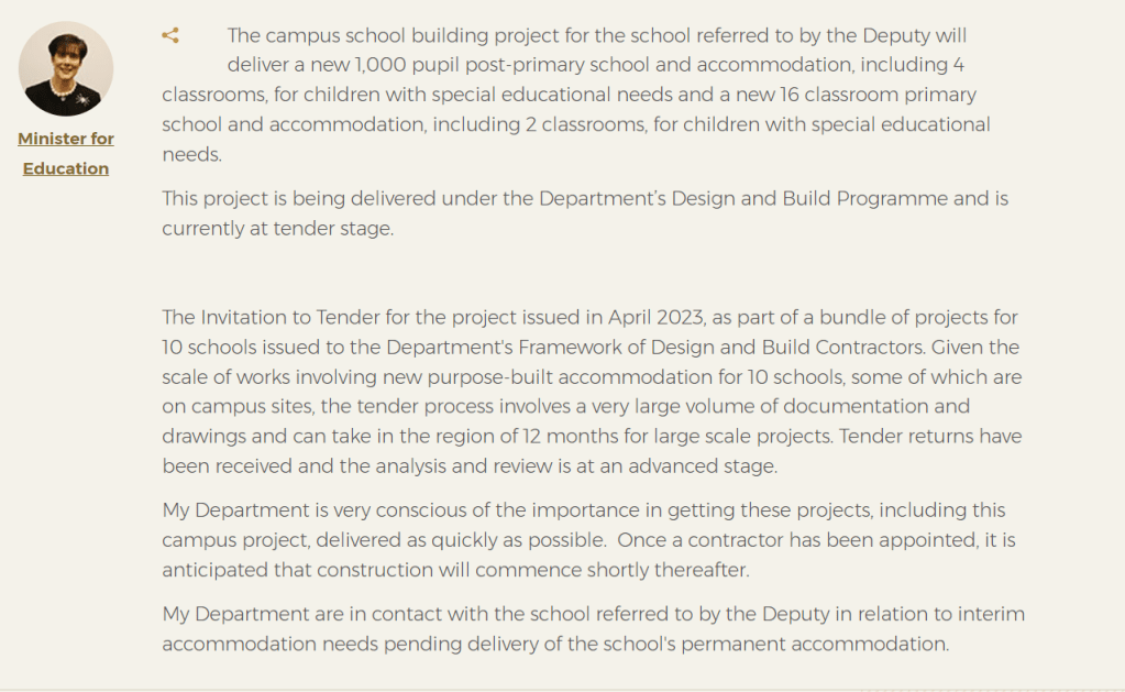 I made a request through Deputy John Lahart’s office to see if a Parliamentary Question could be asked of Minister Norma Foley, requesting an update on where the tender process now stands.