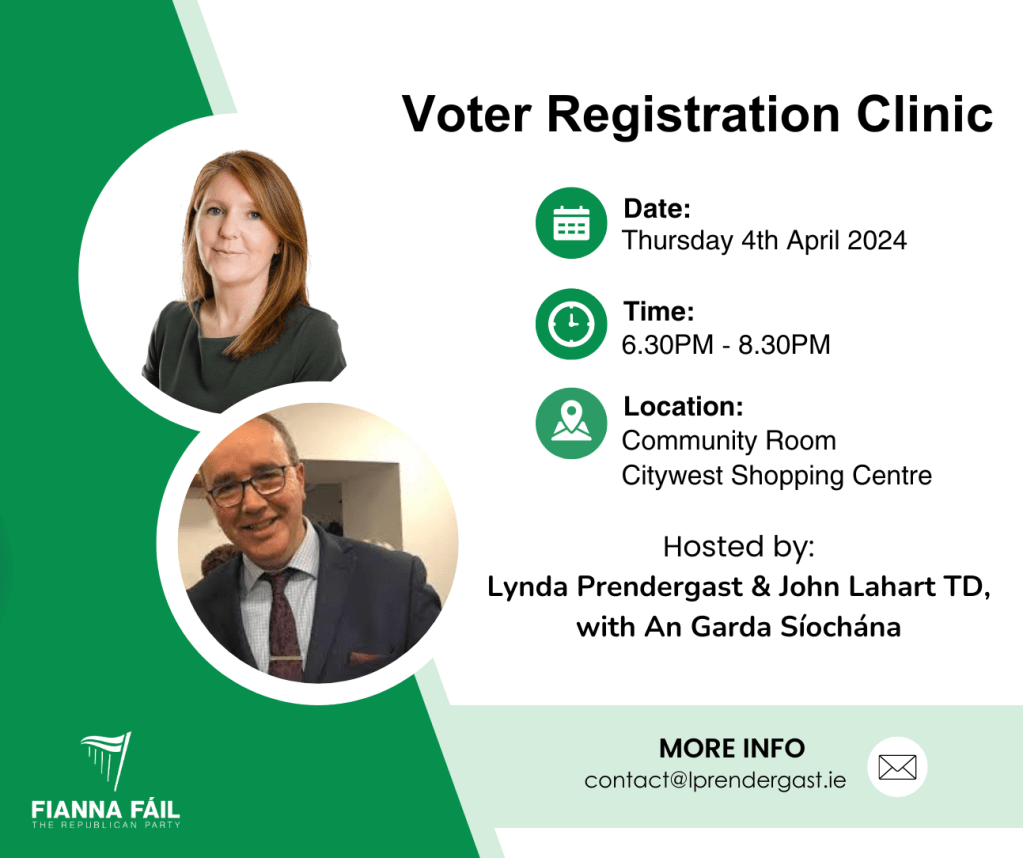 Myself and Deputy John Lahart will host a voters clinic, where you can drop in and we will help you to register to vote. Representatives from An Garda Síochána will be present to stamp registration forms. Drop in any time between 6.30pm & 8.30pm . Please bring passport ID and PPS number.