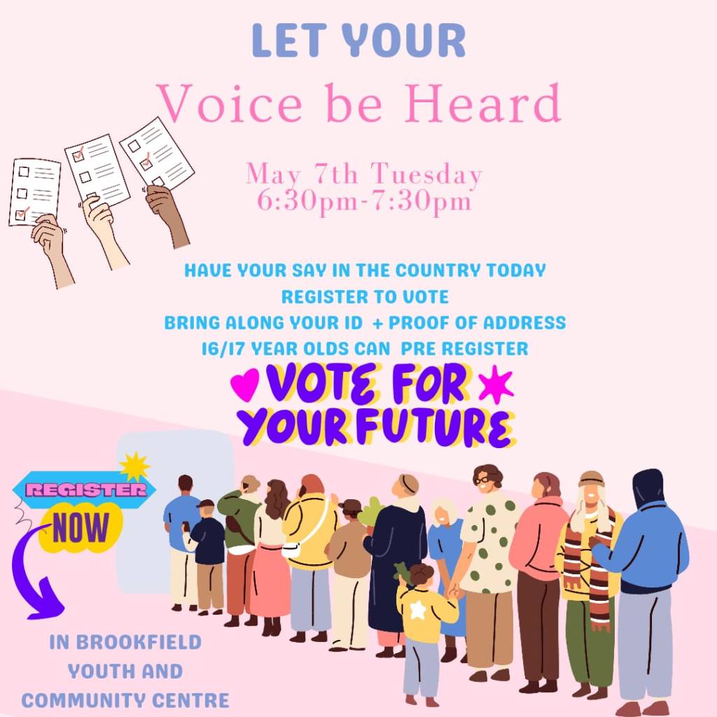 I will be assisting residents to register to vote in Brookfield Youth and Community Centre on Tuesday 7th May 2024
