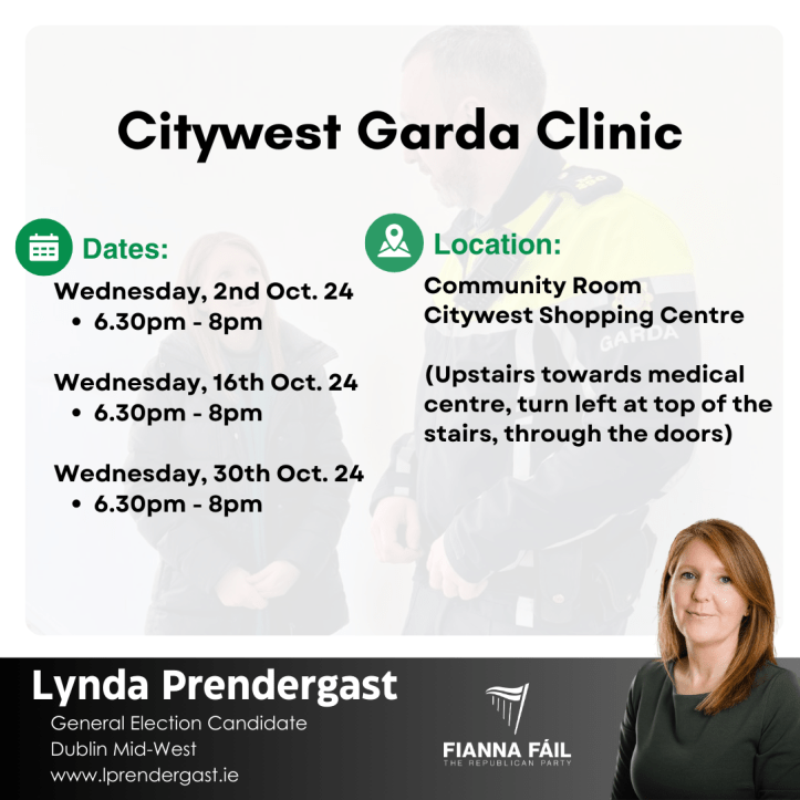 Starting this evening, please see attached details for the Garda Clinics in October. This is a drop in clinic and no appointment is necessary. The clinic is ideal for getting forms signed and for speaking with our Community Gardaí.