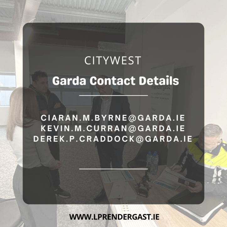 The clinic is for one to one meetings with Gardaí. If any group of residents feel that there is a need for a group/public meeting with Gardaí, this can be arranged separately to the Garda clinic. Please feel free to contact me to assist with this or you may wish to contact our Community Gardaí directly by email – contact details below: