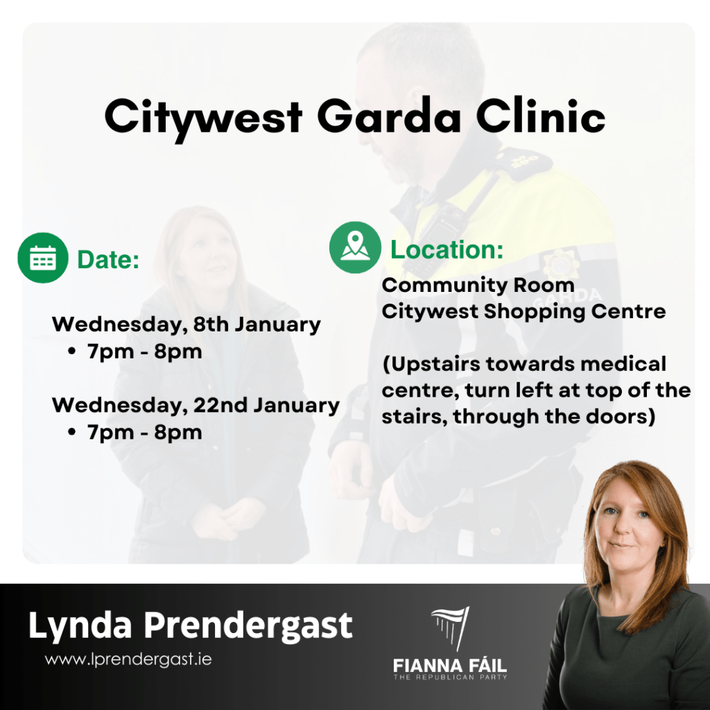 The Citywest Garda Clinics are now scheduled for January 2025. The Garda Clinic is pop-in and no appointment is necessary. Visit the clinic to: